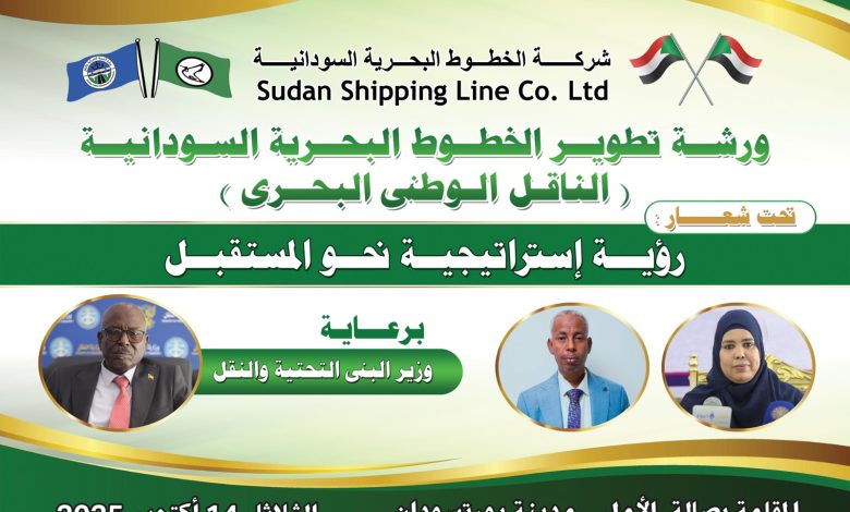 ” تطوير الخطوط البحرية السودانية (الناقل الوطني البحري) ” و ذلك يوم الثلاثاء الموافق 14 أكتوبر 2025 ، من الساعة التاسعة صباحًا و حتى الواحدة ظهرًا، بصالة “أمل” بمدينة بورتسودان، تحت شعار :