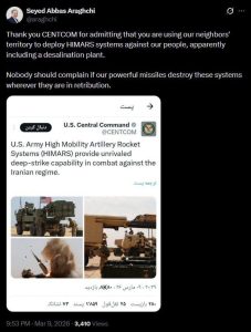 صرح وزير الخارجية الإيراني، عباس عراقجي، في تعليق وجهه مباشرة إلى حساب القيادة المركزية الأمريكية (CENTCOM)، بأن إيران لن تتردد في استهداف أنظمة “هيمارس” الصاروخية التي تنشرها الولايات المتحدة في دول الجوار. وجاء تصريح عراقجي رداً على ما اعتبره اعترافاً أمريكياً باستخدام أراضي دول مجاورة لنشر منظومات دفاعية وهجومية تُستخدم ضد الشعب الإيراني، مشيراً إلى استهداف منشآت حيوية مثل محطات تحلية المياه. وحذر الوزير من أن الصواريخ الإيرانية ستقوم بتدمير هذه الأنظمة “أينما وجدت” في إطار حق الرد والانتقام، مؤكداً أنه لا ينبغي لأحد الشكوى في حال تنفيذ هذه التهديدات.